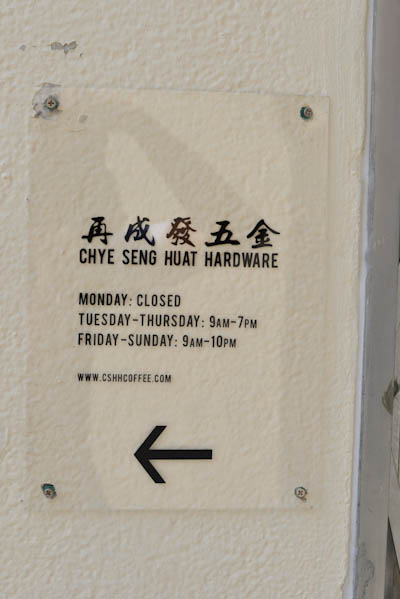| It's quite interesting how coffee shops have become coffee bars and how coffee bars nowadays don't want to tell you they are coffee bars, just like CSHH Chye Seng Huat Hardware 再成發五金. 150 Tyrwhitt Road is in the part town between Lavender Street and Jalan Besar Road where traditional hardware shops throng the area. Folks who are not in the "coffee circle" wouldn't know what's going on behind the facade of Chye Seng Huat Hardware. There's a Coffee Bar, Coffee Retail, The Roastery, The Workshop and The Annex. So there's roasting in here and probably coffee workshops with the available space. They're just opened for 2 days so stay tuned for more activities from the "Hardware shop". |